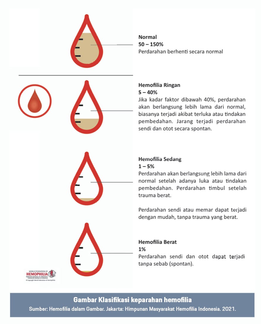 Hemofilia diklasifikasikan menjadi 3 tingkat keparahan berdasarkan kadar faktor pembekuan darah. Waktu timbulnya perdarahan juga dipengaruhi oleh kadar faktor pembekuan darah. Perdarahan pada hemofilia berat dapat dijumpai sejak bayi. Sedangkan perdarahan pada penyandang hemofilia sedang atau ringan terjadi di usia yang lebih tua.