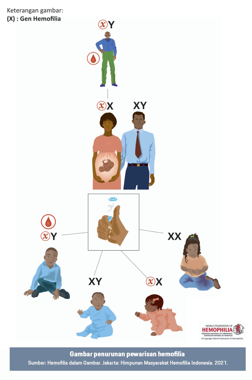 Ibu pembawa gen hemofilia memiliki 1 kromosom X sehat dan 1 kromosom X pembawa hemofilia. Ayah dengan hemofilia memiliki 1 kromosom X pembawa gen hemofilia dan 1 kromosom Y: